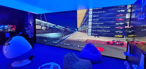 - Fények játéka: A LED fal fényerejét tökéletesen összehangoltuk a díszletben használt kék és lila neoncsövekkel, így a képernyő nem világította túl a jelenetet, hanem harmonikusan olvadt be a "Play Has No Limits" dizájnba.