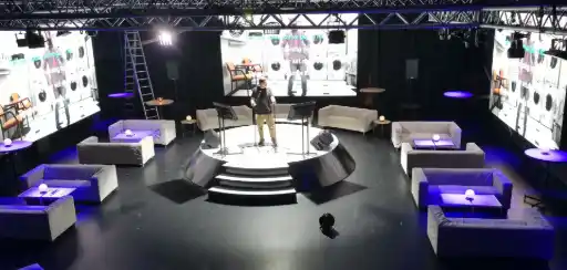 - 360 fokos élmény: A terem falai mentén több nagyméretű LED falat helyeztünk el. Ez a "körbe-vetítés" lehetővé tette, hogy a kamera bármerre foroghatott, mindig látványos, vibráló hátteret látott, nem a csupasz falakat.